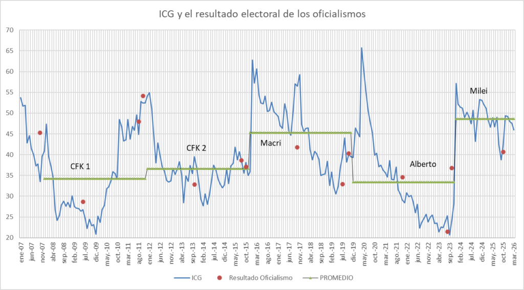 Aunque vale la pena resaltar que también en estos días se dio a conocer otro relevamiento. Nuestro favorito, y el que nos ha dado grandes alegrías al momento de estimar resultados electorales: el Índice de Confianza en el Gobierno (ICG) de la Universidad Torcuato Di Tella y Poliarquía. Este índice, sin ser una encuesta electoral, muestra un altísimo porcentaje de éxito para predecir resultados electorales para los oficialismos.