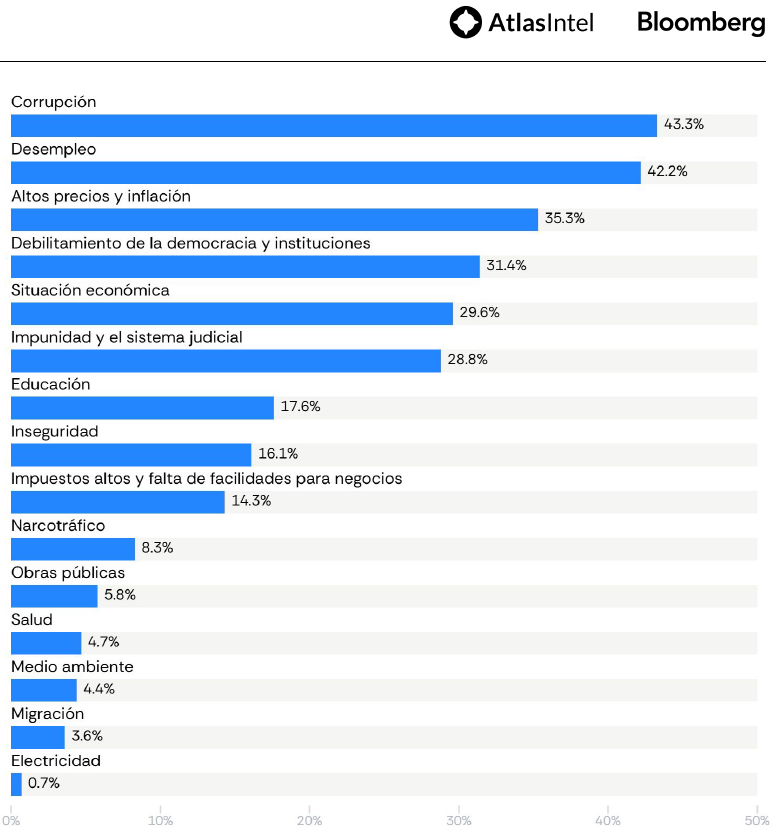 Al margen de estos números, que no deberían ser tomados con tanta significancia en un año sin elecciones, es interesante analizar aspectos cualitativos. La encuesta de AtlasIntel muestra que los principales problemas de acuerdo a los argentinos en la actualidad son la corrupción, el desempleo, y en tercer lugar la inflación.
