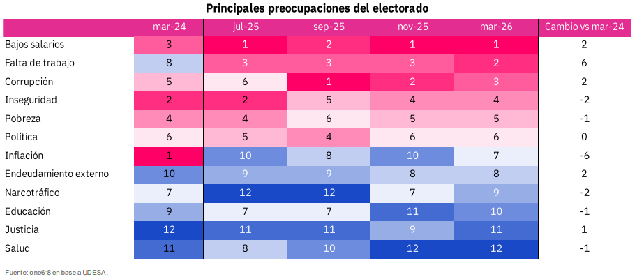 Por su lado, la encuesta de marzo de la Universidad de San Andrés coloca entre las principales preocupaciones del electorado, en primer lugar a los bajos salarios, luego la falta de trabajo, la corrupción, la inseguridad, la pobreza, la política, y recién en séptimo lugar a la inflación.