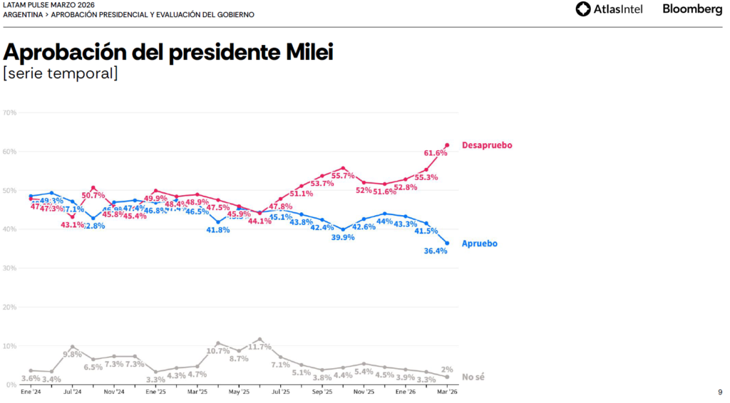 La última encuesta que realizaron y publicaron muestra que la aprobación de Milei ha caído, en marzo de este año, al nivel más bajo desde que asumió la presidencia. Una baja de 5 puntos contra febrero, para alcanzar 36,4%, junto a una suba en la desaprobación hasta casi 62%. Esto se debería a un mix de causas entre las que se destacan denuncias de corrupción, desempleo, y escepticismo por los resultados de los acuerdos alcanzados con Estados Unidos. A esto se suma que por primera vez, la imagen de Milei se encontraría por debajo de un referente de la oposición como Axel Kicillof.