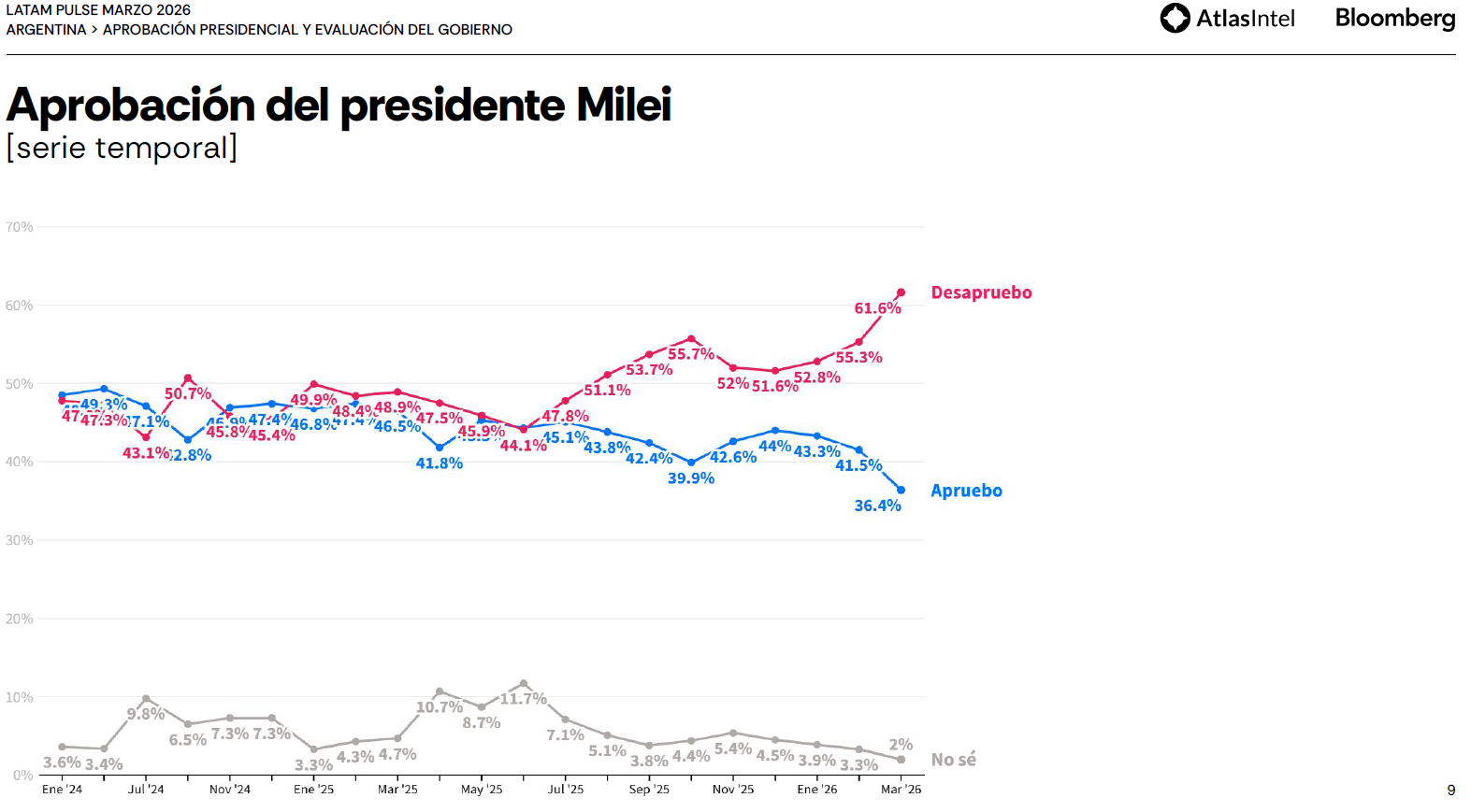 El estudio que más relevancia tomó en estos días fue el de Latam Pulse. Se trata de una iniciativa conjunta entre AtlasIntel y Bloomberg, que proporciona datos sobre la situación política, social y económica de siete países latinoamericanos, entre los que lógicamente se encuentra Argentina. AtlasIntel es una empresa brasileña, que ganó relevancia porque ha anticipado varios resultados electorales con gran éxito, entre ellos el triunfo de Milei en 2023. Y a esto se suma que Bloomberg es uno de los medios de noticias más respetados del mundo financiero.