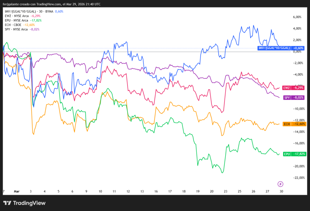 Merval Argentina en USD (azul) comparado con Brasil, S&P 500, Chile y Perú