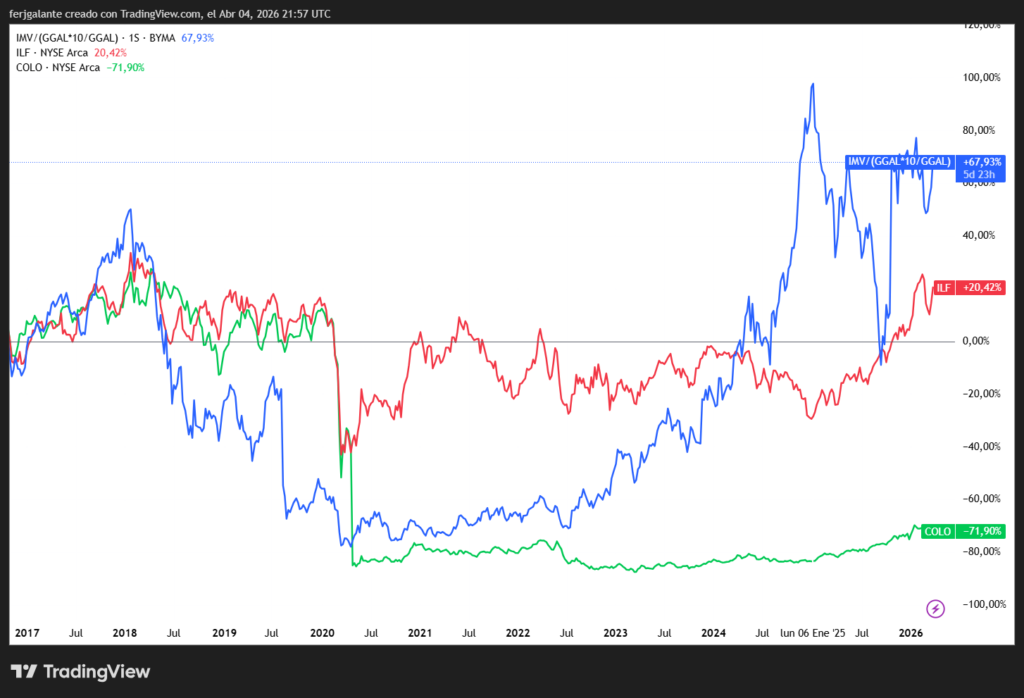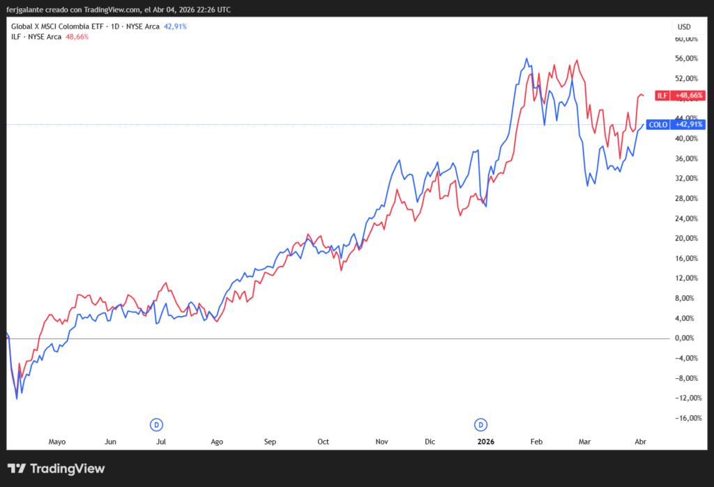 Merval en dólares (azul) – ETF de Latinoamérica (rojo) – ETF de Colombia (verde)