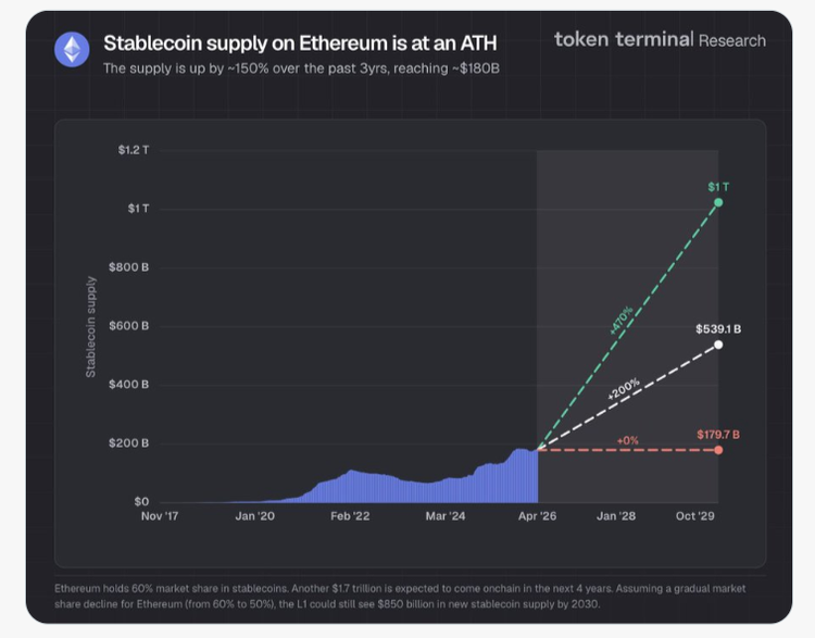 De acuerdo a los datos publicados por Token Terminal, la oferta de Stablecoins en Ethereum ha alcanzado un máximo histórico de aproximadamente USD 180 mil millones, subiendo alrededor de USD 150 mil millones en los últimos 3 años. Logrando de esta manera un 60% de participación de mercado. Es decir que Ethereum no sólo está liderando, sino que se está transformando en la autopista financiera de los dólares digitales.